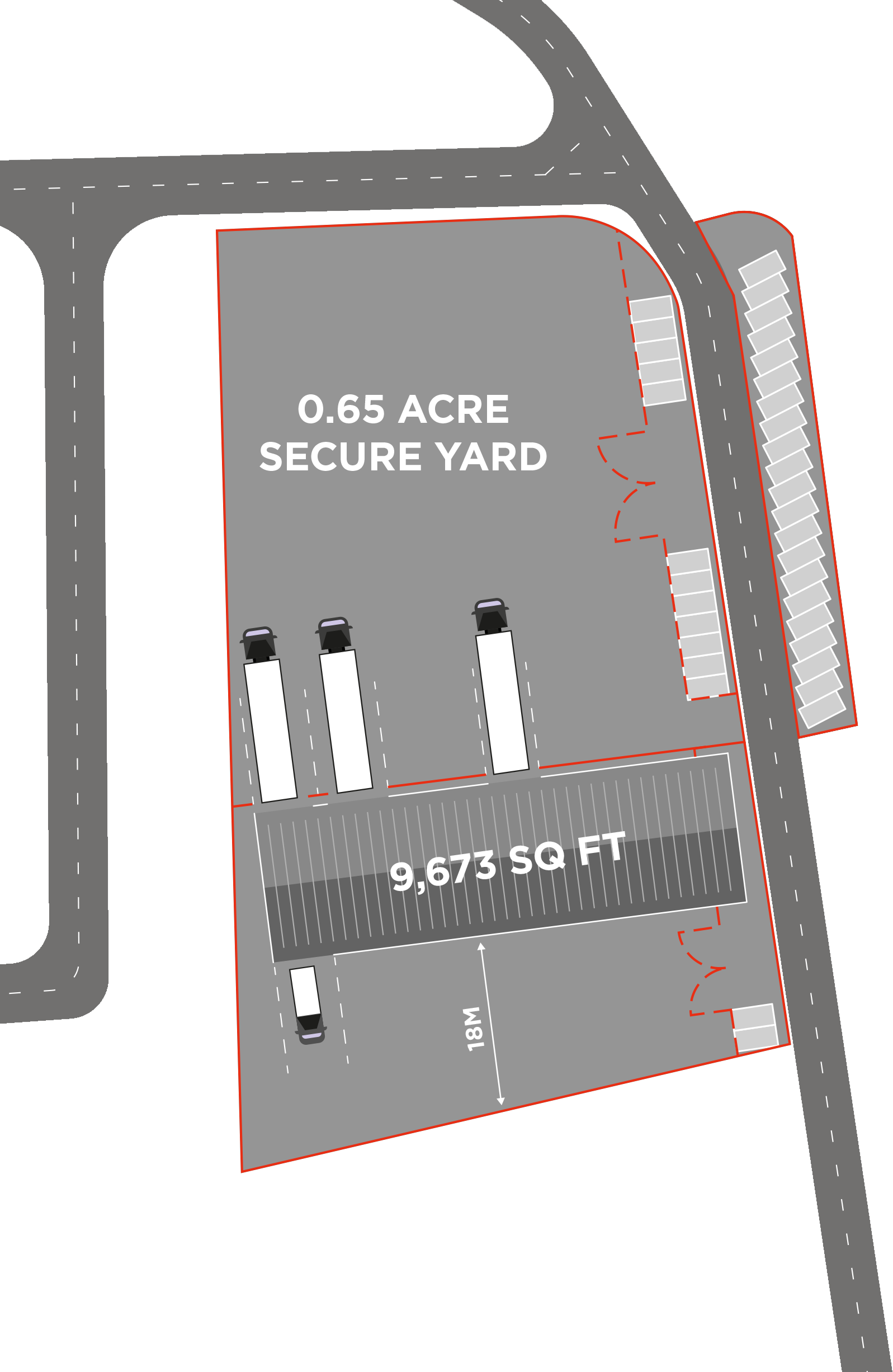 The unit benefits from new, high specification first floor offices that front the access road. A steel palisade fence surrounds a concrete, hard standing yard to provide a fully secure area. There are vehicular access points to the front and rear of the building and in the current layout, vehicles can circulate between the yards via the northern point of the demise. Alternatively, the 28,100 sq ft (0.65 acre) yard can be self-contained and leased independently of the building.
